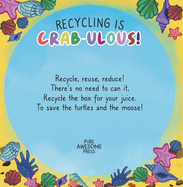 In this story, Sherbet the Hermit Crab learns about recycling in his neighborhood, from reusing clothes to composting. Recycling is crucial for a cleaner planet. How can you reduce your footprint and creatively reuse old items?